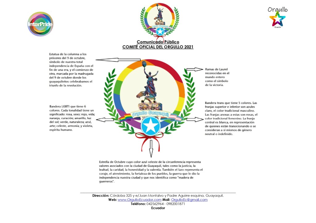 En este primer comunicado del 2021, nos complace informar para el caso de Orgullo Guayaquil las mejoras que hemos realizado, primeramente, al logo del Orgullo de la Perla del Pacífico, el mismo que explicamos a continuación: Estatua de la columna a los próceres del 9 de octubre, símbolo de nuestra total independencia de España con el fin de una era, y el comienzo de otra, marcada por la madrugada del 9 de octubre donde los guayaquileños celebrábamos el triunfo de la revolución. Ramas de Laurel reconocida en el mundo entero como el símbolo de la victoria. Bandera trans que tiene 5 colores. Las franjas superior e inferior son azules claro, el color tradicional masculino. Las franjas anexas a estas son rosas, el color tradicional femenino. La franja central es blanca, en representación de quienes están transicionando o se consideran a sí mismos de género neutral o indefinido. Bandera LGBTI que tiene 6 colores. Cada tonalidad tiene un significado: rosa, sexo; rojo, vida; naranja, curación; amarillo, luz del sol; verde, naturaleza; azul, arte; celeste, armonía; y violeta, espíritu humano. Estrella de Octubre cuyo color azul celeste de la circunferencia representa valores asociados con la ciudad de Guayaquil, tales como la justicia, la lealtad, la caridad, la honestidad y la valentía. También el lazo rojo representa el coraje, el atrevimiento, la fortaleza de los pueblos, la guerra que le dio la independencia nuestra ciudad y que nos identifica como «madera de guerreros». La finalidad de estos cambios es mantener vivo el patriotismo en particular por la ciudad de Guayaquil, combinada con la inclusión de las poblaciones LGBTI. El logo fue diseñado y donado por un joven transmasculino.