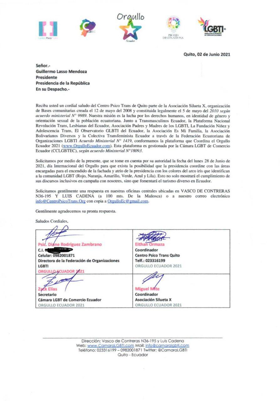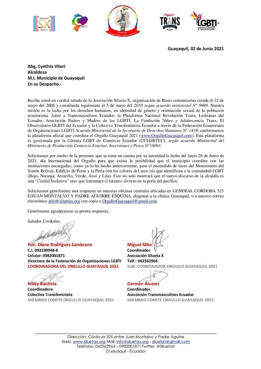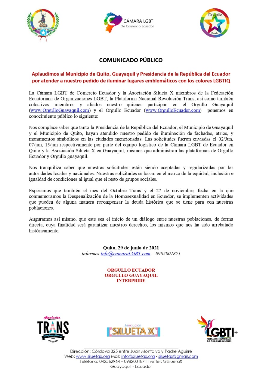 La Cámara LGBT de Comercio Ecuador y la Asociación Silueta X miembros de la Federación Ecuatoriana de Organizaciones LGBT, la Plataforma Nacional Revolución Trans, así como también colectivos miembros y aliados nuestro quienes participan en el Orgullo Guayaquil (www.OrgulloGuayaquil.com) y el Orgullo Ecuador (www.OrgulloEcuador.com) ponemos en conocimiento público lo siguiente: