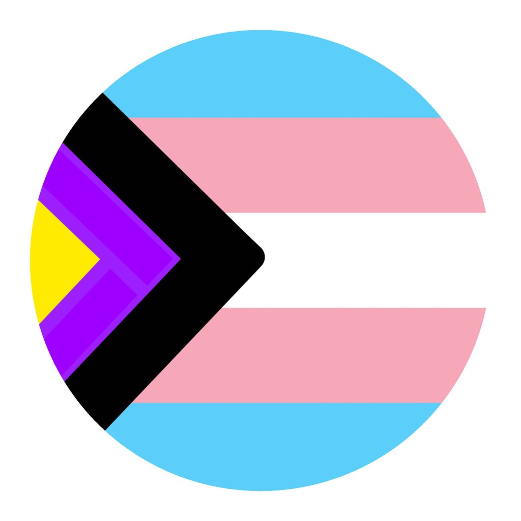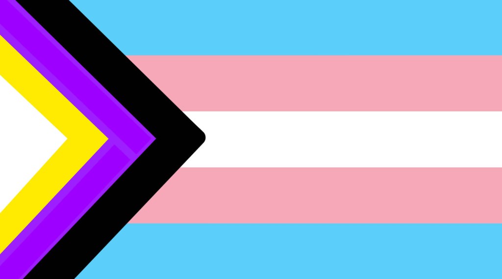 Bandera del progreso trans no binarie por Diane Rodríguez & Zack Elías, pareja trans no binaria.