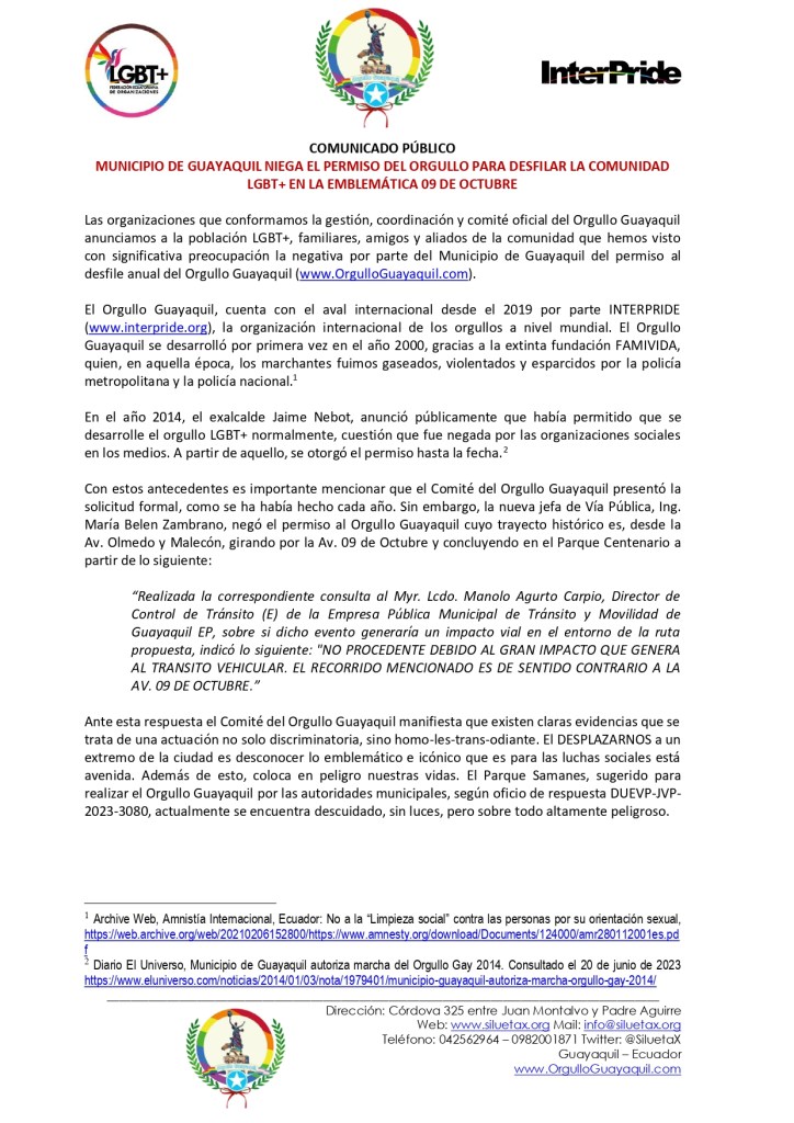Las organizaciones que conformamos la gestión, coordinación y comité oficial del Orgullo Guayaquil anunciamos a la población LGBT+, familiares, amigos y aliados de la comunidad que hemos visto con significativa preocupación la negativa por parte del Municipio de Guayaquil del permiso al desfile anual del Orgullo Guayaquil (www.OrgulloGuayaquil.com).