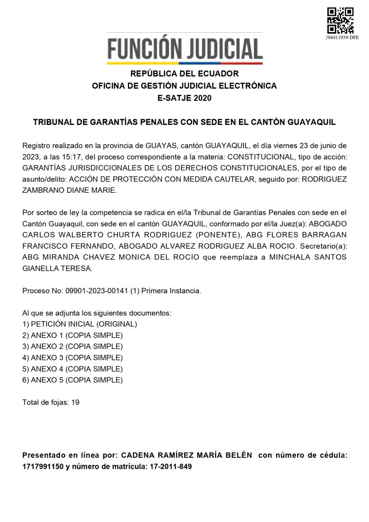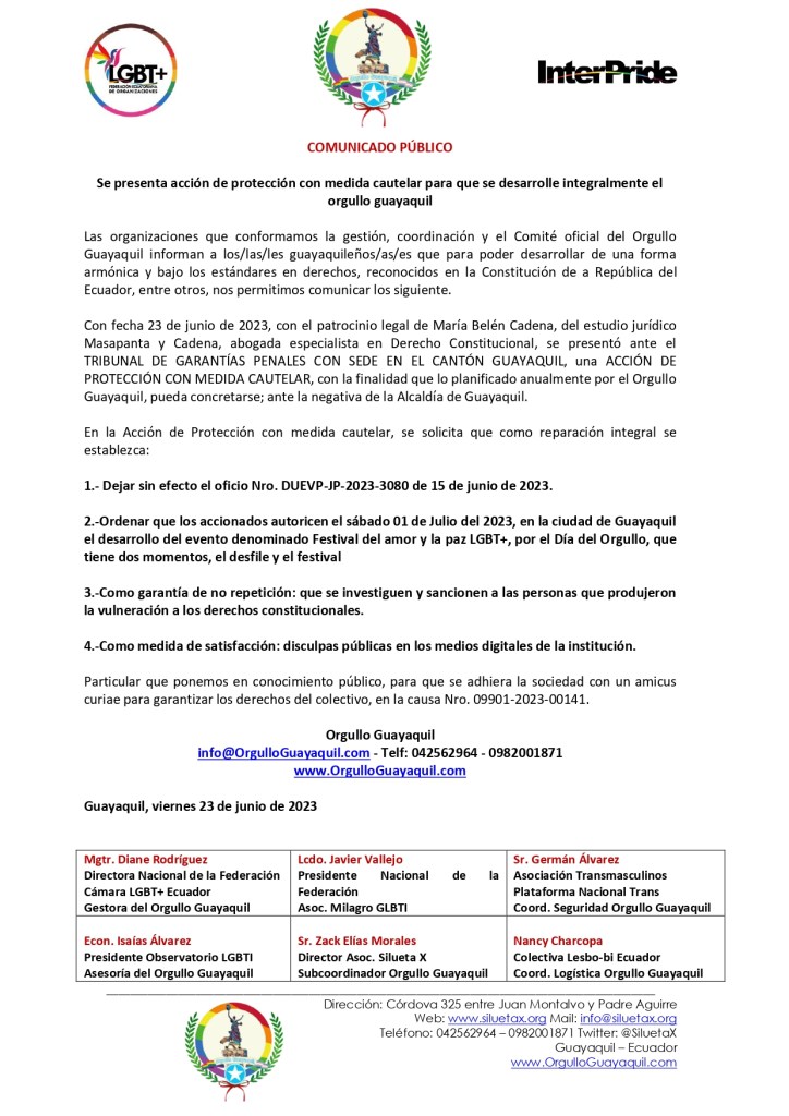 Con fecha 23 de junio de 2023, con el patrocinio legal de María Belén Cadena, del estudio jurídico Masapanta y Cadena, abogada especialista en Derecho Constitucional, se presentó ante el TRIBUNAL DE GARANTÍAS PENALES CON SEDE EN EL CANTÓN GUAYAQUIL, una ACCIÓN DE PROTECCIÓN CON MEDIDA CAUTELAR, con la finalidad que lo planificado anualmente por el Orgullo Guayaquil, pueda concretarse; ante la negativa de la Alcaldía de Guayaquil.