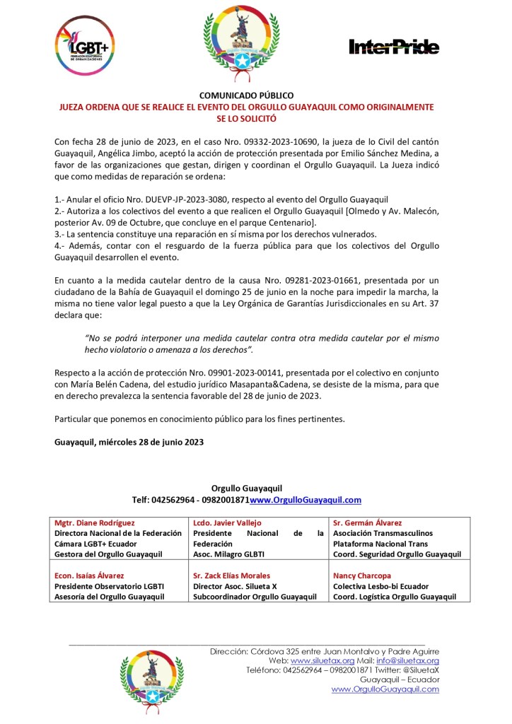 Con fecha 28 de junio de 2023, en el caso Nro. 09332-2023-10690, la jueza de lo Civil del cantón Guayaquil, Angélica Jimbo, aceptó la acción de protección presentada por Emilio Sánchez Medina, a favor de las organizaciones que gestan, dirigen y coordinan el Orgullo Guayaquil. La Jueza indicó que como medidas de reparación se ordena: