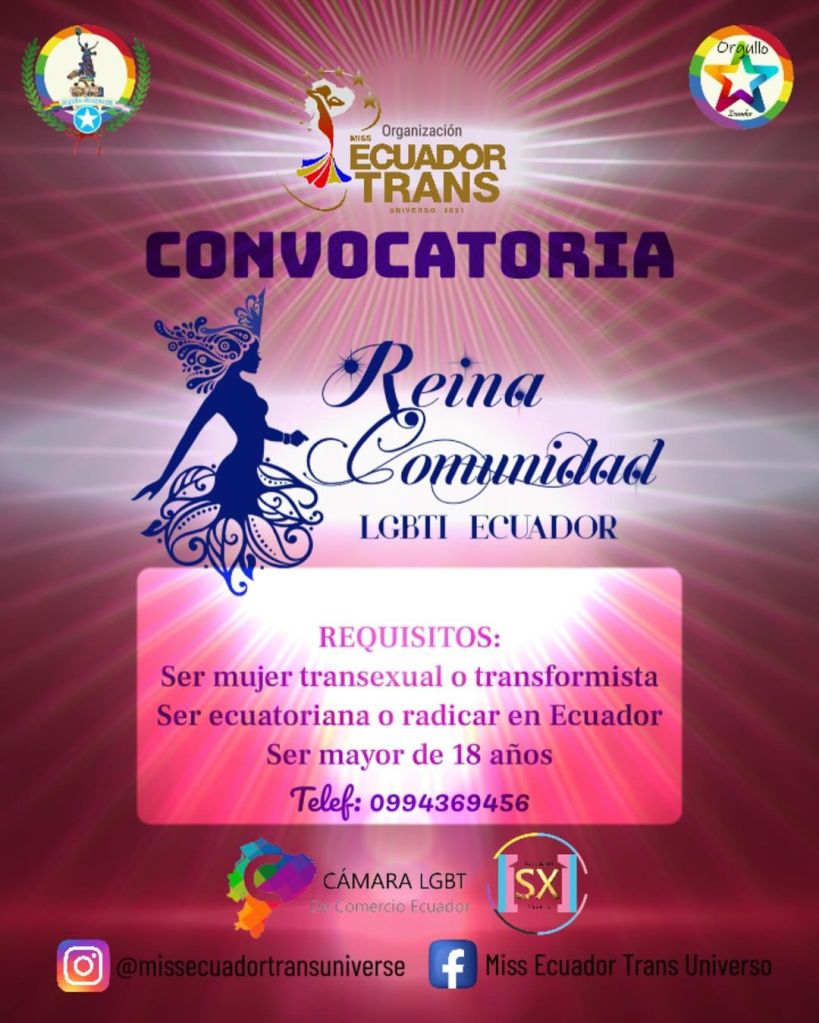 REINA DE LA COMUNIDAD LGBTI+ 2024 Publicado por Anunciante el 3 mayo, 202426 agosto, 2024 Inscripciones abiertas para REINA DE LA COMUNIDAD LGBTI 2024Inscríbete al 0994369456 Comparte esto: Haz clic para compartir en X (Se abre en una ventana nueva) X Haz clic para compartir en Facebook (Se abre en una ventana nueva) Facebook Haz clic para compartir en Telegram (Se abre en una ventana nueva) Telegram Haz clic para compartir en WhatsApp (Se abre en una ventana nueva) WhatsApp Me gusta Cargando... Relacionado
