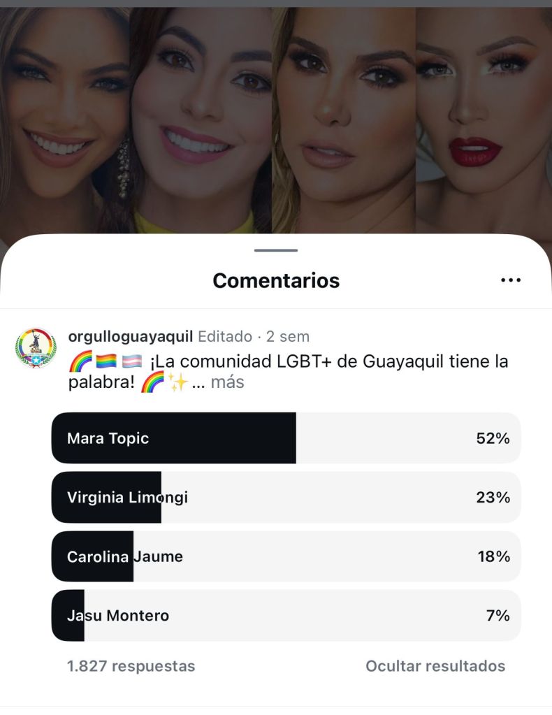 La votación, realizada a través de la red social instagram, reflejó la pasión y el compromiso de la comunidad, con una participación que superó todas las expectativas. Mara Topic, conocida por su apoyo activo a la comunidad LGBTI+ y su destacada presencia en medios y redes sociales, se alzó como la favorita, consolidando su liderazgo y conexión con los valores de Orgullo Guayaquil.
